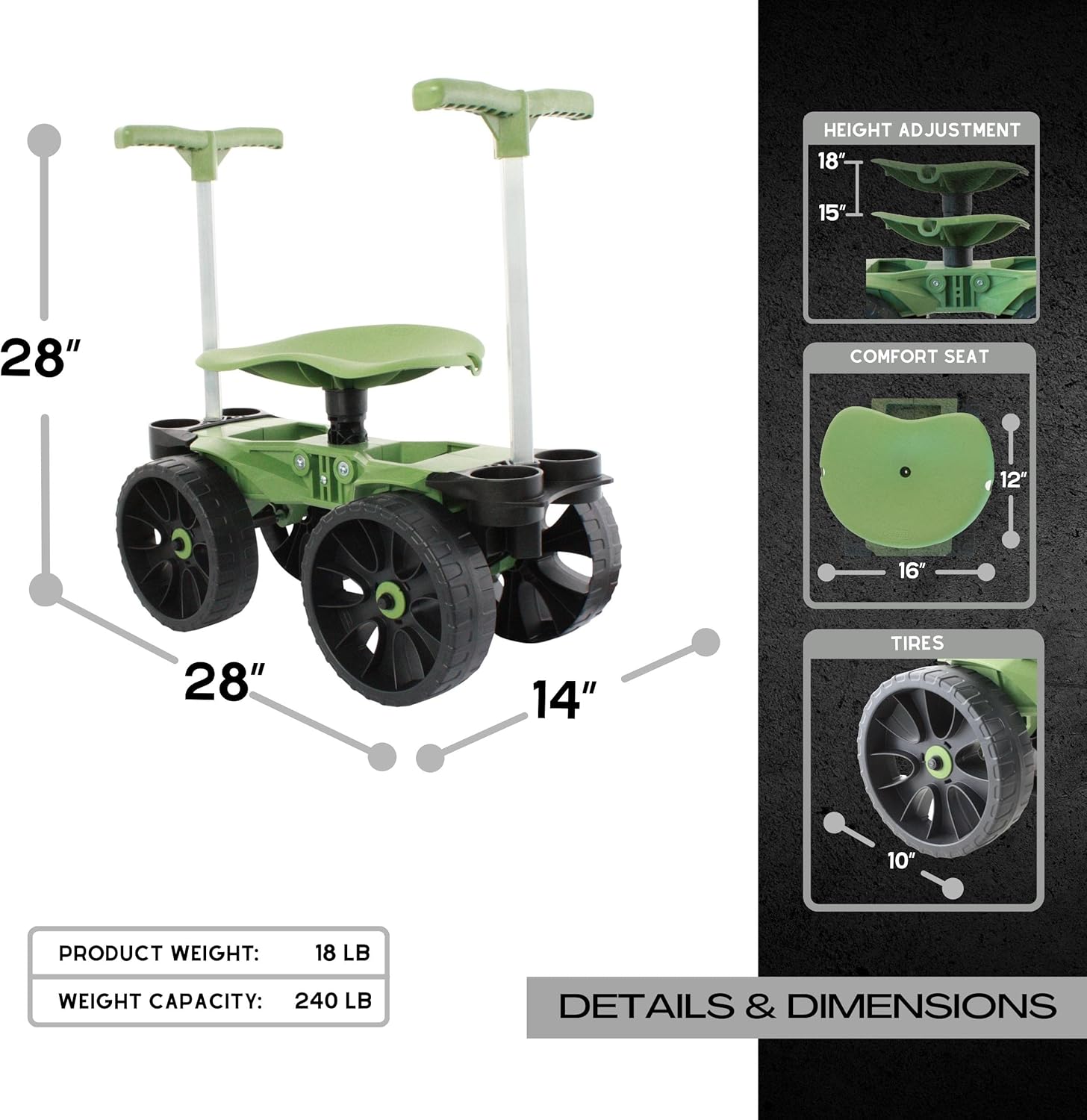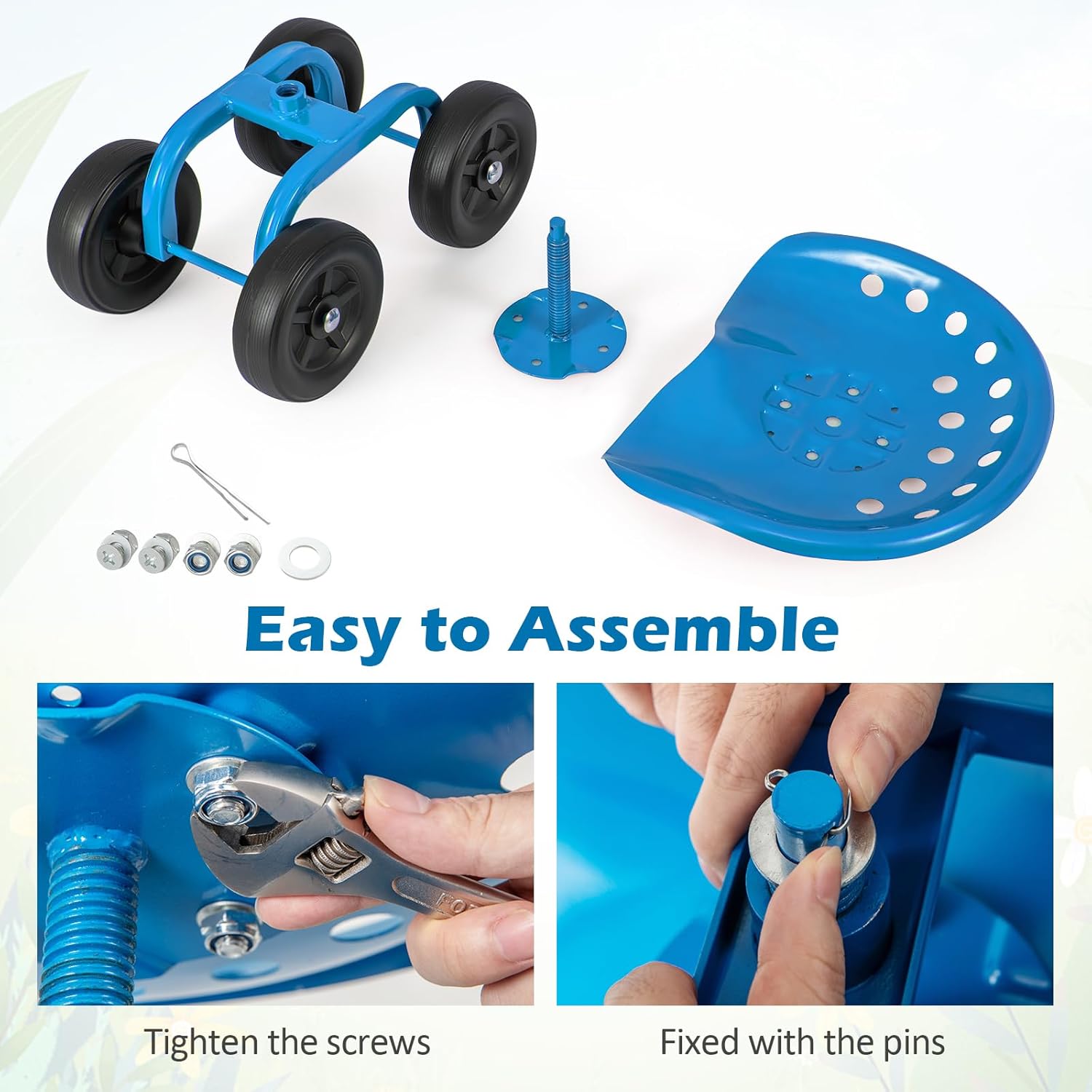 Benefits: Rolling, Adjustable Specs: 8.3 lbs, Steel Frame/Plastic Seat, Rolling Seat/Kneeling |